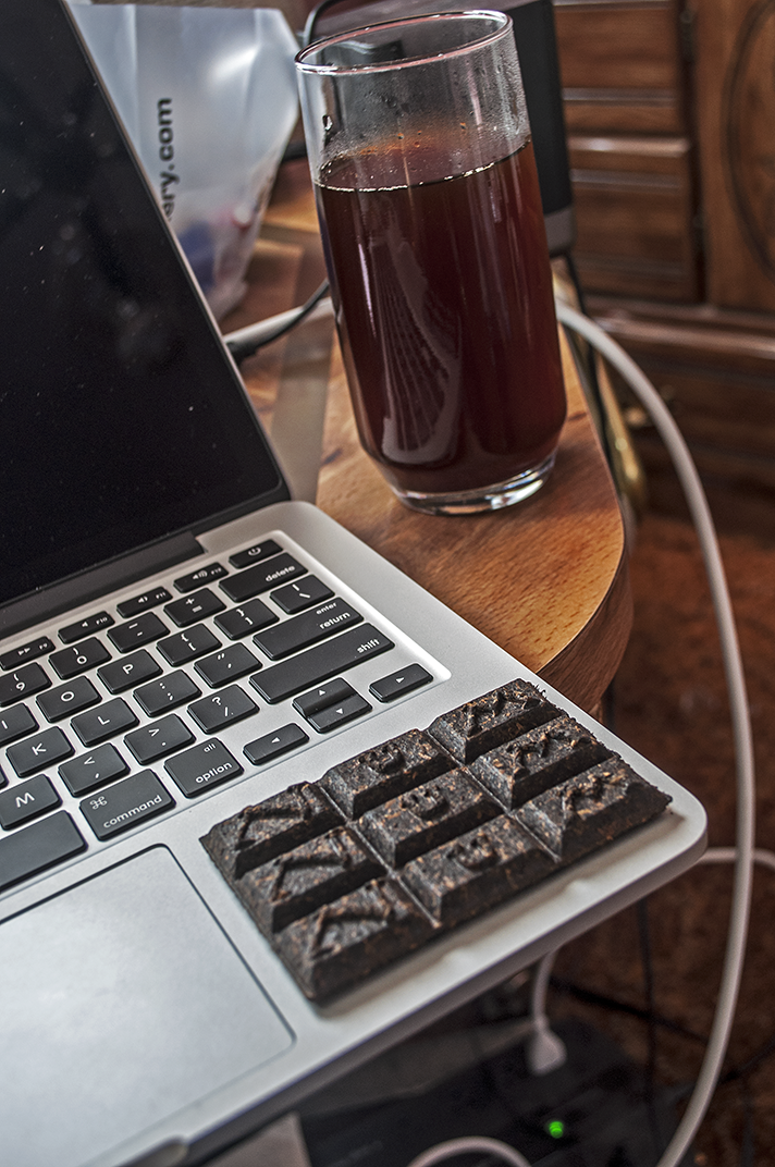 Today I’m drinking Numi‘s (not quite novelty) Aged Pu-erh Tea Brick – compressed organic loose tea. Basically, they’ve taken the traditional bird’s nest tuocha and shaped it into a candy bar (of joy and rapture). Why not? Tuocha had been done to death and this is so much easier to package. ;)