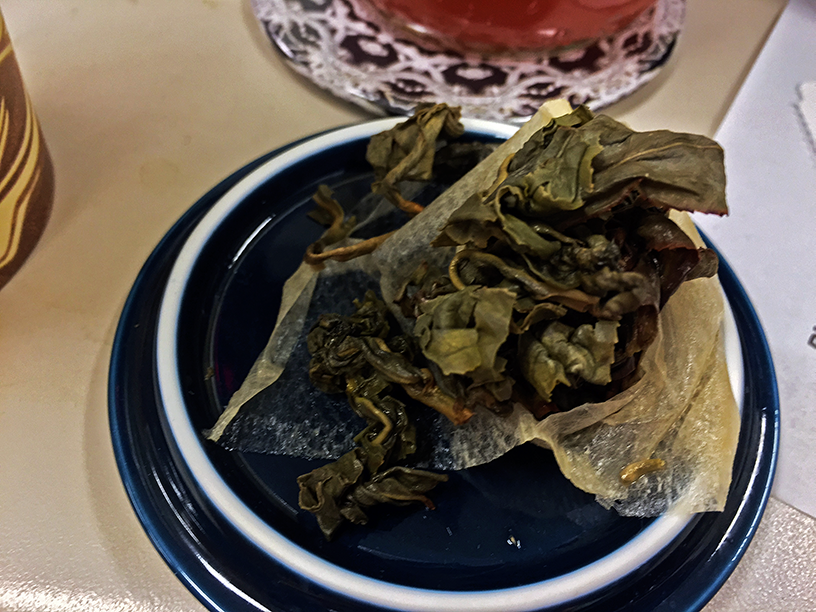 Regarding Jin Xuan, I especially enjoyed the aroma of… well, honey… honey and more honey. xD For a fully-oxidized Oolong, Jin Xuan is a little bland to my taste buds, but then I don’t drink much Oolong. I did notice Jin Xuan is substantially thinner than most of the other Oolongs I’ve reviewed this week, though this may be due to brewing a 16oz tea’s worth of leaf in a constricting, folded-over tea bag. The spent tea unfurled well though. I’ll definitely try one of their other hot teas when I get a round tuit.