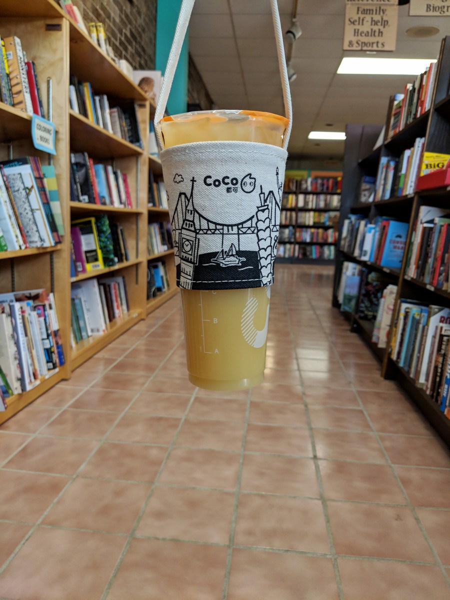 I’d known that CoCo Fresh Tea & Juice was coming for some time, thanks to its proximity to my favorite bookstore. I’m close with the owners of Bookbound (pictured below) and they’d mentioned that the former smoke shop next door to them was being turned into a tea shop over a year ago. It wasn’t clear until they finally put up their awning a couple months back that we were getting a CoCo. I’m vaguely familiar with CoCo Fresh Tea & Juice (the seeming adjectival mistake in its title stuck with me) from a trip to LA a few years back, but only enough to make me really want to explore (and blog about) this new hyperlocal option. The exact timing of the soft open was unclear, but i regularly glanced at the storefront out the bus window on my ride home from work. It finally opened this week, at the very end of the semester, but with only word of mouth as advertising… that, and the visible and omnipresent lines that sprang up.